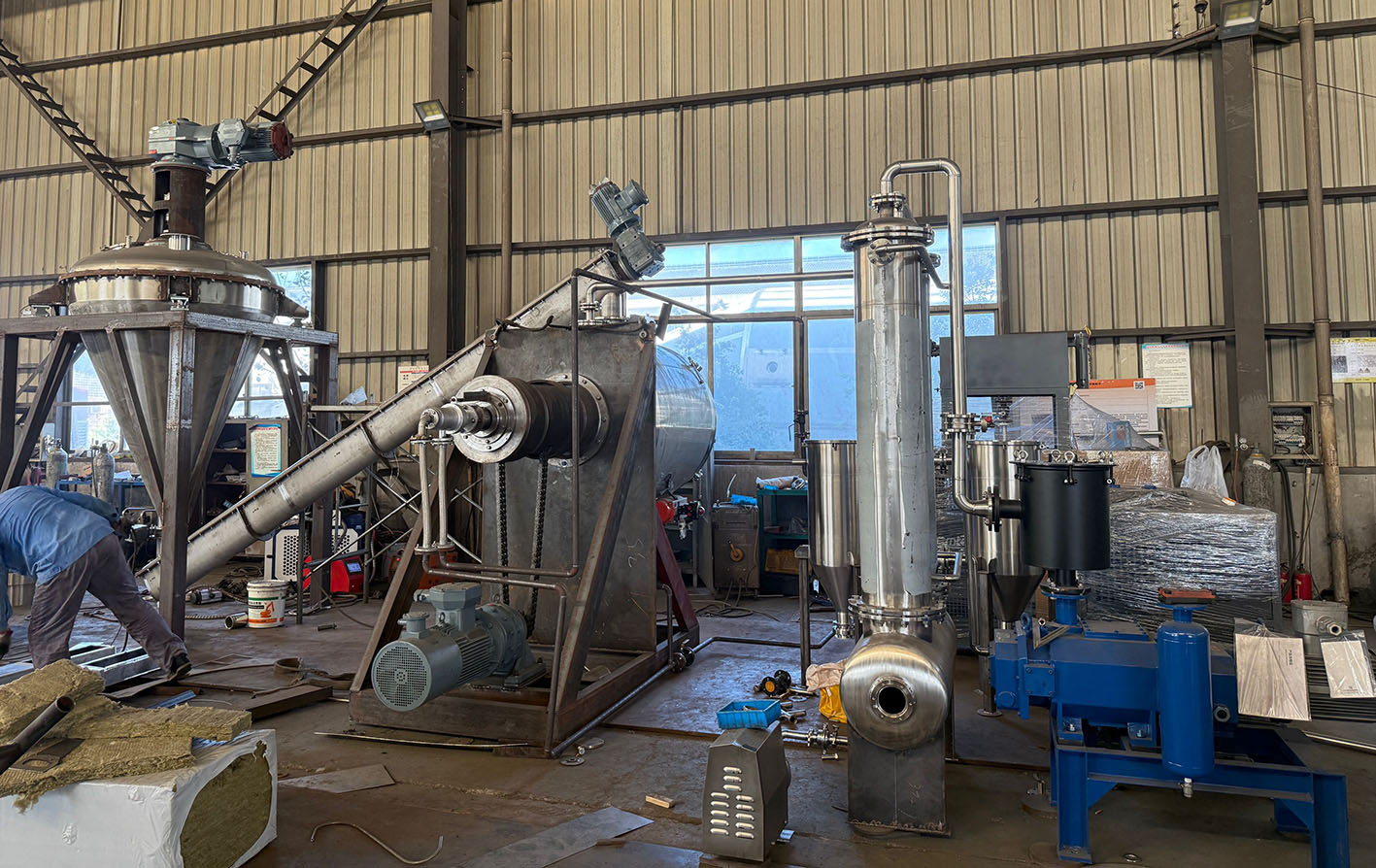 真空干燥單元:由耙式真空干燥機、導熱油爐、真空泵及真空管路組成,通過 “真空降沸點 + 導熱油供熱” 實現物料低溫干燥。