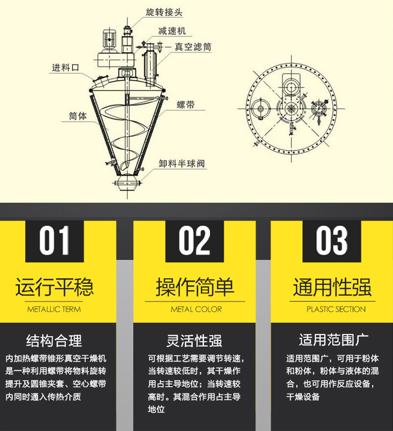 錐形螺帶真空混合/干燥機可以在許多領域得到應用;特別適用于密閉和可控制環(huán)境下的工藝處理,如制藥化工領域以及添加物,在空氣或高溫下不穩(wěn)定的提取物結晶體和各種醫(yī)藥生物工藝,力度干燥生產(chǎn)的多用途錐形螺帶真空混合/干燥機設備是解決您生產(chǎn)需要的理想選擇。